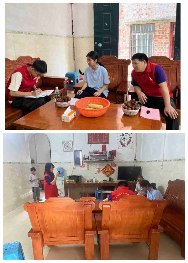 到雯婷家的村屯已经快临近中午了,天气逐渐闷热了起来,我和老师们刚到屯口,就看到雯婷流着汗穿着校服在附近招呼我们过来了。因为是周六,学生一大早就可以从学校回家休息了,雯婷家离田阳高中是很远的,听雯婷说坐班车大概要一个小时左右的时间,她自己也是刚到没多久,身上的校服还没来得及换。到了雯婷的家门口,我发现家里的装修还可以(是雯婷父亲在世有劳动力的时候装修的),有瓷砖修饰,共有两层,最高层是用来存放杂物和谷物的地方,家里有一台洗衣机,其余的基础家具也一应俱全。尔后我们在客厅里进行座谈交流,雯婷给我的第一印象是一个老实本分的女孩子,瘦瘦高高,当我问她未来有什么规划时,她毫不犹豫地说出来自己想当兵的想法,我表示肯定。接着我问她家里存在什么困难时,她说父亲去世后,目前是单亲家庭,家中有4口人,只有母亲是在外务工,爷爷因年迈无法提供经济支持,弟弟就读于南山实验小学,家里供两个人读书,家庭收入并不稳定,家庭开支比较大。雯婷爷爷也坐在一旁,他双眼有神,但身体年迈,显露的手臂和双腿可以清楚地看到苍老的青筋,我问家里的收入主要来着哪里呢,雯婷爷爷说主要是来着孩子母亲在外务工和家里种一些农作物如玉米这些,但现在爷爷的身体不太好了,在种农作物的时候往往心有余而力不足;孩子母亲在务工的时候也不是很稳定,工作时常会换。临走前,我勉励劳雯婷要好好学习,在学习上有什么困难要及时和老师沟通交流,雯婷点了点头,我和老师们走出去没多久,又见到雯婷小跑出来送我们出去,很懂事的孩子,在这样的家庭环境是应该是担着不少的责任和压力,相信这家人未来会越来越好。