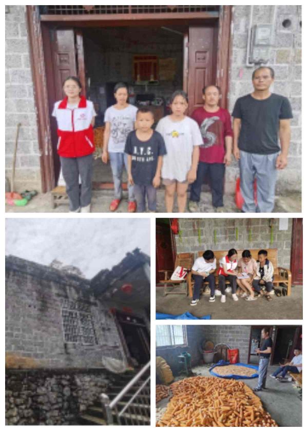 我们一行人从大同乡人民政府出发到大同乡弄彦村弄果屯的丽英、国龙两姐弟家中进行家访,距离乡人民政府大概40分钟车程。据了解,他们两姐弟的父亲已经去世,母亲改嫁,现在他们住在叔叔家,叔叔家是一层平房,条件也不好,房屋内外都未装修;进入家中,地上摆满了玉米,家中条件设施都比较陈旧简陋,客厅摆放一张双层上下铺的床,经询问是堂哥和弟弟国龙睡的地方,家中有三个房间,一个是奶奶的房间,丽英和奶奶一起睡,方便照顾双目失明且因病卧床的奶奶(10月份回访的时候奶奶已经去世);还有一个是叔叔婶婶住的,另一个房间的堂姐们(三个堂姐合住)住的。经询问,国龙姐弟的家在距离叔叔家大概20米的地方,约60平米的砖混结构房屋。