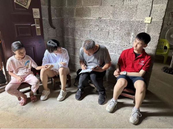 这是个四面环山中间地势很低的小山村,进村后我们在村中间的篮球场等诗雨的奶奶来给我们带路,村子里的房子建得很密,像迷宫一样,外来人员第一次来很容易迷路。进入诗雨家后,引入眼帘的是那没有经过任何粉刷装饰的墙壁,房间里虽然简陋但十分的整洁。房子建于2011年,两层半。奶奶不会讲普通话,诗雨当起了我们的小翻译,但我们沟通起来还是有点困难,这时邻居大一位大叔过来帮忙翻译,我们才得以继续。经过交谈得知:诗雨爸爸在2021年1月16日因交通事故意外离世,原本幸福的家庭因为这次意外事故的出现而发生了重大改变。从此养家的重担就落到了诗雨妈妈一人身上了,一家五口,仅靠她一人在外打工来维系生活,而且三个小孩都在上学,家里的花销可想而知是多么庞大的一笔开销。诗雨妈妈为了减少开支,常年在广东打工,只有在春节才回家与奶奶和孩子们团聚。