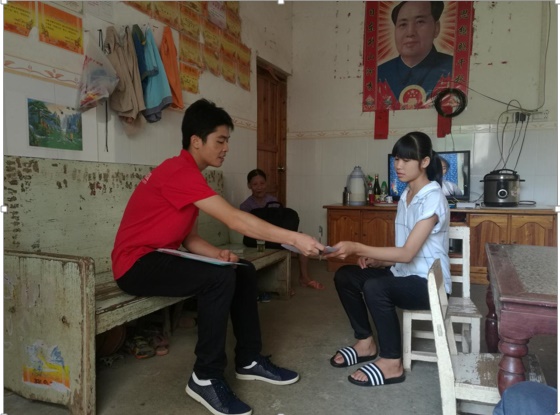 当我们来到小燕家里的时候,首先看到的是三层混转房子,看到这个首先想到的就是能起三层房子,那家里面应该是比较好的,怎么会不能供小孩读书呢?带着这个疑问,我们走进了小燕的家里,刚好今天妈妈去走亲戚没在家,只有奶奶和她在家,小燕给我们的第一印象是个听话懂事、文静的女生。小燕家里面比较简陋,只有一台电视和几台风扇,墙上布满了奖状,主要是她和她姐姐的,可以看出她在学校表现还很优异。通过和小燕的聊天里面了解到她父亲在外打工,妈妈在家务农,家里的2亩田地收入基本能够家里面用的,奶奶因为年纪稍微大一些,所以基本上没有什么劳作能力了,家里面总共有4个孩子,大姐小海今年刚满十八岁,在初三就辍学去广东打工了,平常的收入也只能维持自己的生活;二姐小华,16岁,现在岑中读书,成绩在班级里处在中游;妹妹小菲,9岁,现在读小学,成绩一般;弟弟小天,7岁,在读学前班。村干部和隔壁邻居跟我们说小燕家的房子是08年开始起的第一层,到现在才慢慢陆续完成的,在之前精准扶贫的审核中也是因为门前一小部分贴了瓷砖没有能够评上,所以家里压力是蛮大的。