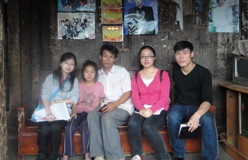 这家一共有五个小孩,满妹是老四,上面有三个姐姐,还有一个8岁的弟弟。为了养活这么一大家子,供孩子们读书,妈妈常年在外打工,一年到头难得回来一次,爸爸也在附近做杂活,多赚一分是一分。看着爸爸干瘦的身体,很难想象他在自己胃病反复发作的情况下还要辛苦支撑起这个家。而最让我们感动的是,即使是这种揭不开锅的情况,家里的五个孩子全部在读书,大姐已经上大学,二姐、三姐在上中学,小弟也上二年级了。可见,爸爸、妈妈是多么重视孩子们的教育,在自己身心高度疲惫的状况下始终坚持送他们读书。当我们问爸爸“如果条件允许,您愿意让孩子始终一直读下去吗?”他微微低头,抹了一把泪水,立即抬起头对我们说,“其实,我们家因为超生已经罚款三万多了,每次到开学或者自己要看病得时候就到处借钱。但是,孩子是自己的,再苦再累我们没有怨言。供他们上学是父母的责任,但是我们5个小孩,确实困难。所以你们能来,我太感谢了!”说完,爸爸的眼角又泛起了泪花,他轻轻地把满妹揽到怀中,叮咛到“你看,老师们这么关心你,可要好好读书啊。”满妹看看爸爸,又看看我们,羞涩的答道“嗯。”